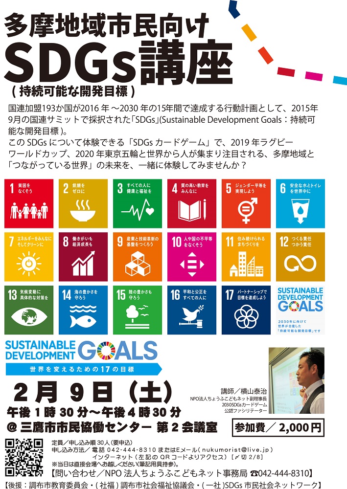 その道のりを体感できるカードゲーム「2030 SDGs(ニイゼロサンゼロ エスディージーズ)」で、2019年ラグビーワールドカップ、2020年東京五輪と世界から人が集まり注目される調布と多摩地域からせk世界未来を一緒に体験してみませんか?