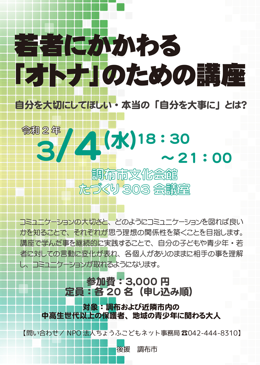 新型肺炎コロナウイルスの感染拡大防止のため、「(3月4日)若者にかかわる「オトナ」のための講座」は中止とさせていただきます。