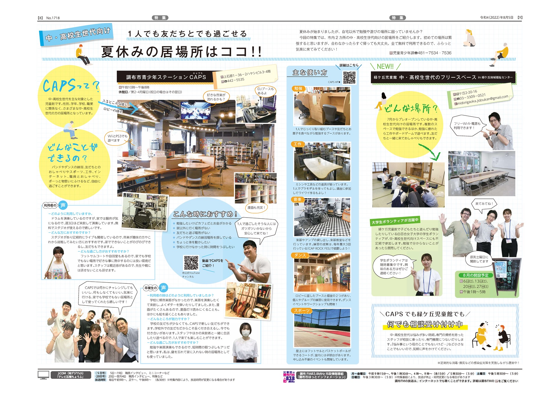 令和4年8月5日号では「中高校生世代の居場所」が特集され、こどもネットが運営している「調布市青少年ステーションCAPS」と、緑ヶ丘児童館が7月より始めた「中高校生世代フリースペース」について掲載されています。