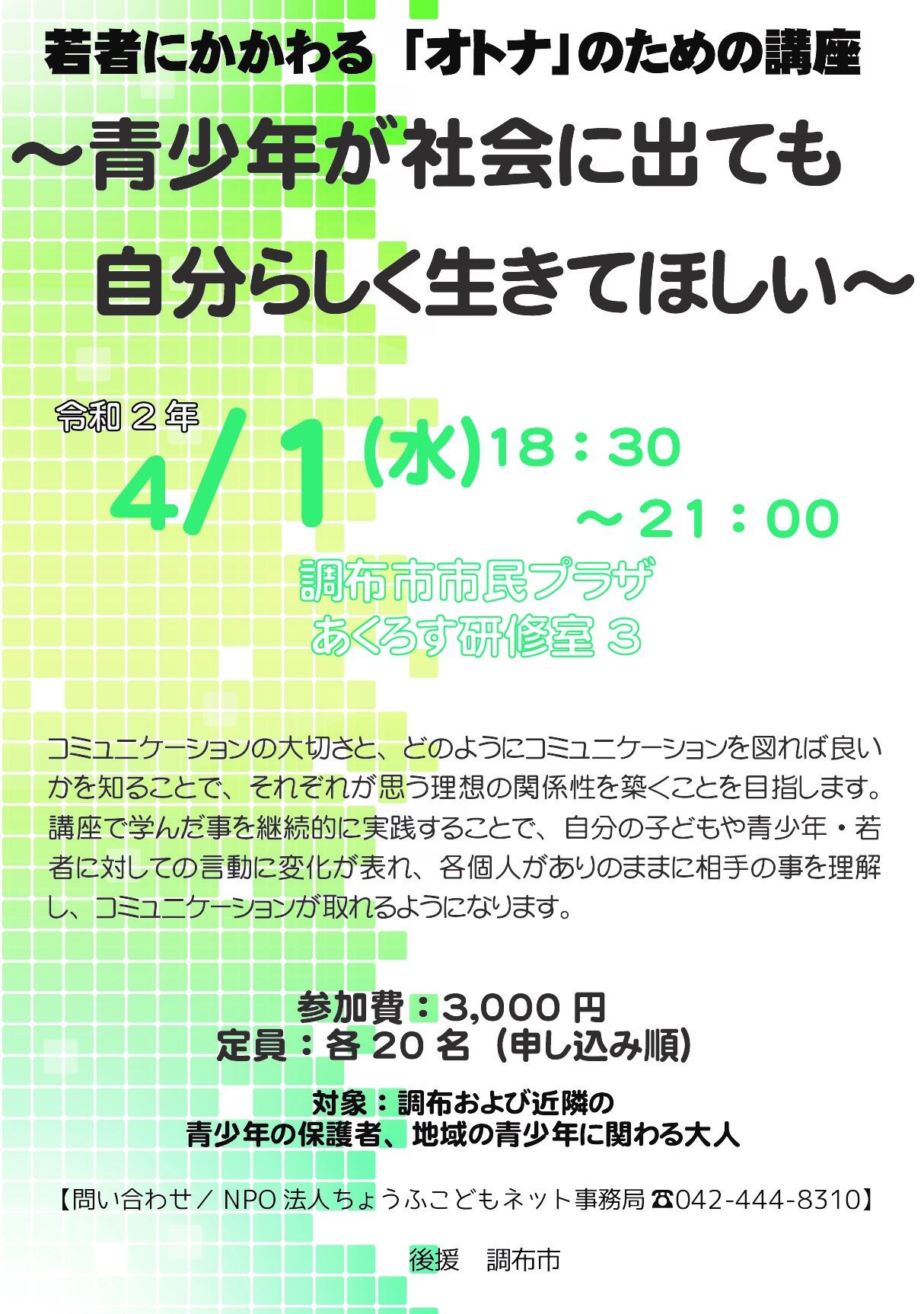 新型肺炎コロナウイルスの感染拡大防止のため、「(4月1日)若者にかかわる「オトナ」のための講座」は中止とさせていただきます。